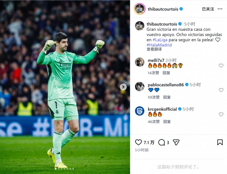 达成皇马生涯西甲150胜!库尔图瓦社媒庆祝:继续为冠军而战!