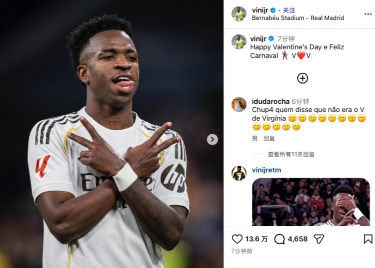 梅开二度+两造点,维尼修斯社媒:情人节快乐,尽情狂欢吧!