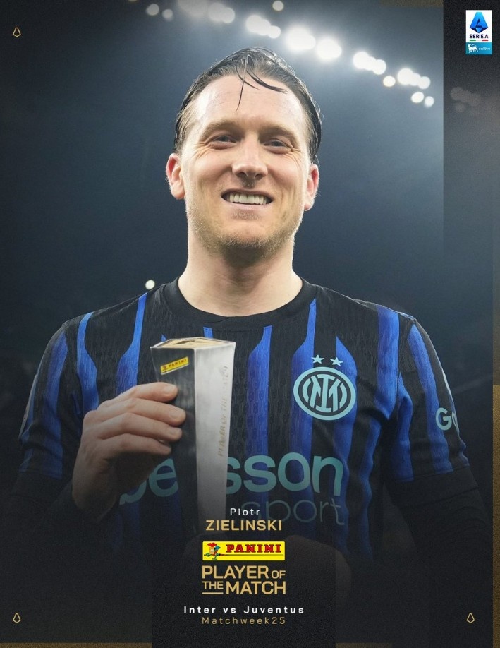 90分钟远射绝杀,意甲官方:泽林斯基当选国米3-2尤文全场最佳