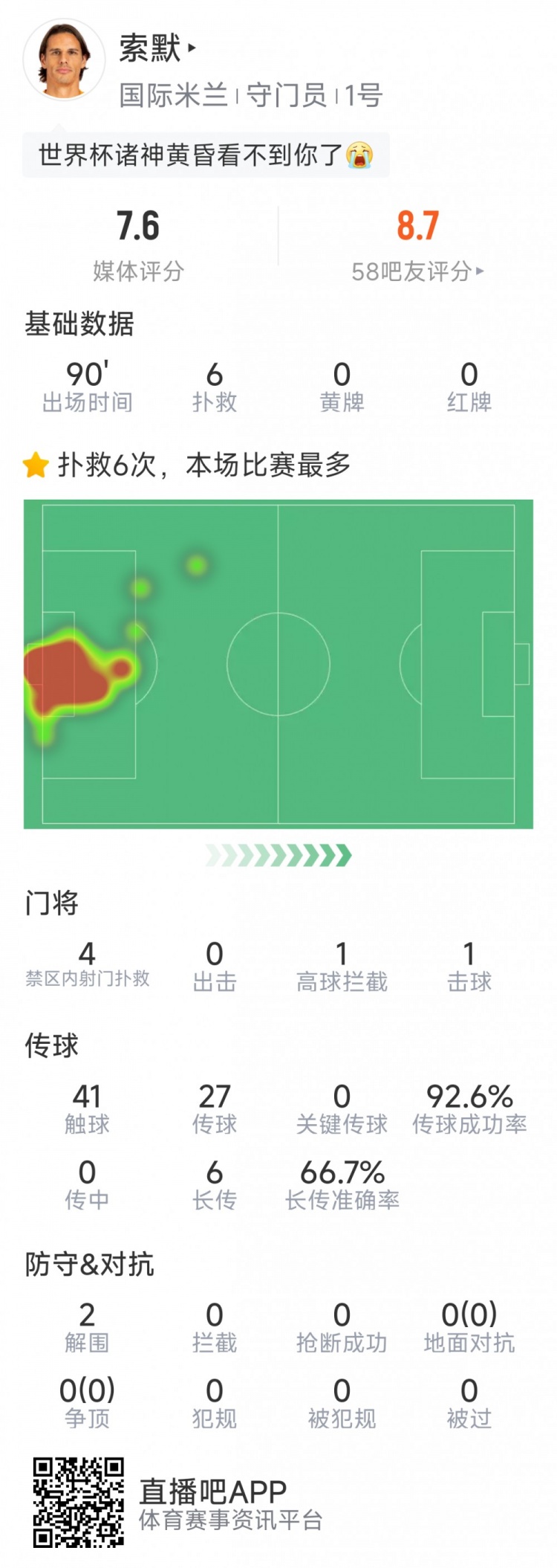 索默本场数据:6次成功扑救守住胜利,2次解围,评分7.6分